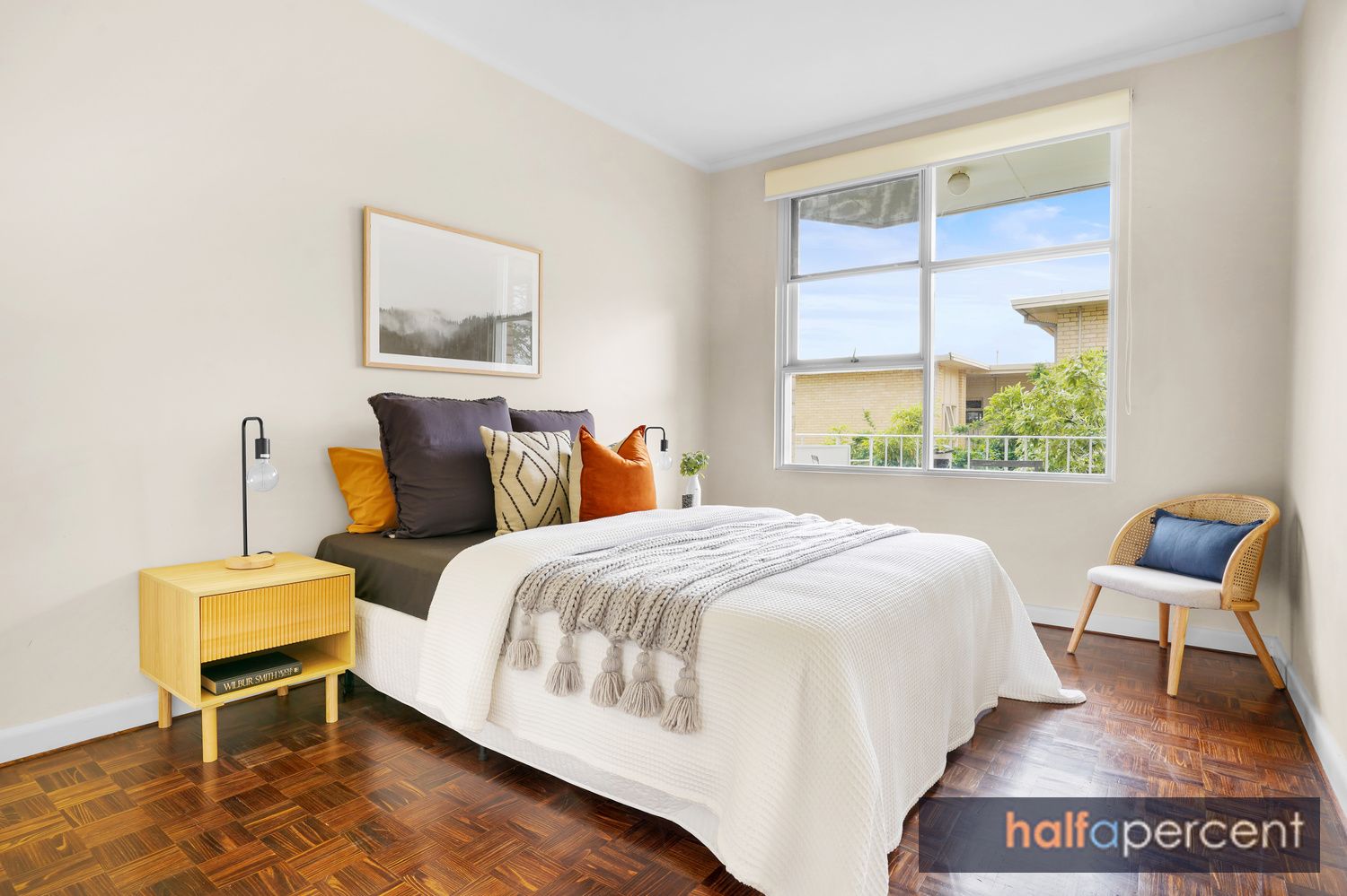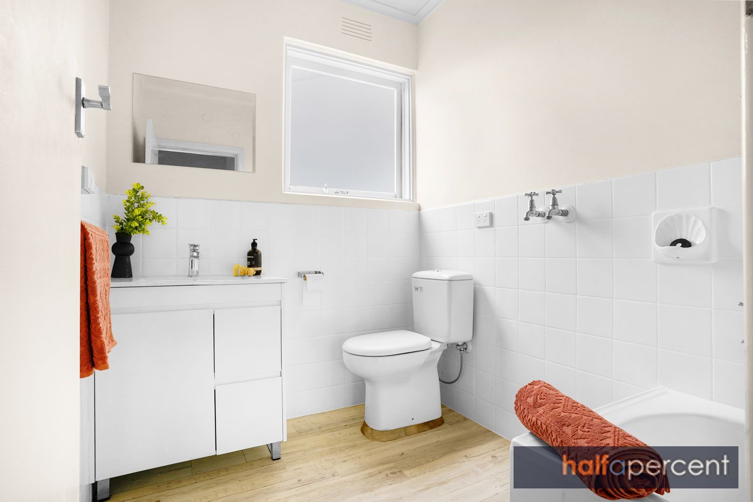 Two bedrooms with BIRs share their own zone with a tiled bathroom; the master bedroom offering generous king bed size, with solid internal walls and a treed outlook. Impeccable presentation, with a dedicated entry hall, "timber like floors